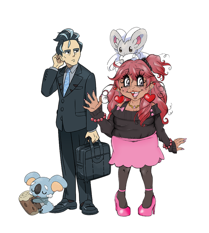 Larry might have been the first friend that Fifi ever made upon her arrival to Paldea, as she had originally worked and lived in Medali before moving to Mesagoza. The title of "very best friend" appears to be self-appointed by Fifi, but the passing years show that he soon begins to reciprocate that notion towards her, albeit in his own way. Fifi seems to uphold a (self-appointed) tradition to have dinner together with him at least once a week at the Treasure Eatery as when they first met, she would constantly run into him. He doesn't always offer much to say in response to her discussions, but picks up on details. She considers him to be a great listener. Despite her propensity to speak enthusiastically, she has learned how to speak more softly and calmly with him, without diminishing her passion for her favorite discussion topics. In her past, she would have loved to have a friend to just unload her both her happiness and woes to. This plays a big factor as to why she eventually fell for him, in addition to his battle skill.He found her befuddling, but knew she wasn't loud on purpose and was able to catch on to when her energy was a farce, especially after she had long shifts at work. She found him more quiet than she was used to, but she greatly appreciated when he firmly but politely told her to quiet down when she got to be too much. (Throughout most of her life, she was shunned rudely for being passionate about her hobbies). From there she gets better at understanding and matching his energy & mannerisms. Their friendship starts off quietly and cordially, but Fifi grows comfortable with sharing snippets of her day and eventually going on long winded diatribes about her special interests, much to his chagrin. Whenever she has something she can't really discuss with her friends at the academy, he is usually the one she ends up (drunkenly) pouring her heart out to for better or worse. She did not know anything about his roles in the Pokemon League until after she takes on the Gym Challenge and her Champion's Assessment.Through the course of her Gym Challenge, Fifi manages to uphold her promise to meet with Larry for their dinners, though she begins to feel somewhat different around him upon realizing that he works for the Paldea League. After she loses to him the initial time she takes her Champion's assessment, she begins to feel smaller and timid around him, feeling like a weak nuisance, so she takes a siesta from dinners at Treasure in the meantime. After a brief respite (chaperoning a field trip in Kitakami, and touring Blueberry Academy), she finds that one of the main reasons she took her loss to him so hard was because she looked up to his skill (his lack of motivation be damned). She was beginning to see him as both an important friend, and something beyond that.Upon Fifi's initial confession, the two of them pondered if either of them were suited for a romance. Fifi reflected on mistreatment she endured in previous relationships. Larry felt unsuited for a relationship as he had expressed little interest and desire for one throughout the course of his life, causing disappointments in the previous relationships he did have. Both felt they would be too busy due to their different jobs. Fifi suggests taking things slow, or even agreeing to stay close and seeing how things develop, to which he tentatively agreed. Fifi was surprised by how comfortable she felt in such a simple relationship, where things felt more or less the same as they had been friends. Later on, she confesses once more, and he responds saying that he "quite enjoys [her] company", which she gleefully takes as a reciprocation and embraces him. She is excited to think about a simple but secure future with someone she considers a true friend.Both of them prefer to keep their relationship on the down-low in public for various reasons. They appear either as friends or lovers to those who know about their relationship, as they hold no notion of a relationship hierarchy. They continue to maintain their friendships with themselves and others as much as their relationship.